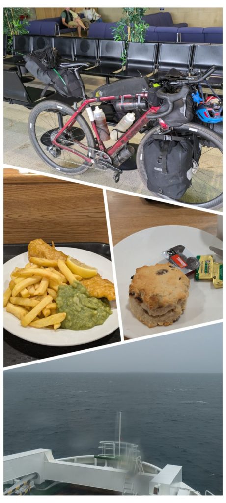 Auf der Fähre von Cairnryan nach Larne in Nordirland gibt’s dann Mittagessen: Fisch and Chips mit Mushy Peas. Danach einen Cappuccino und ein „this please whatever it is“ dazu. Und ja, i hab schon wieder eine frühere Fähre als ursprünglich gebucht genommen. I bin von London rauf a paar km mehr als geplant gefahren pro Tag und jetzt bin i heute schon auf der Fähre und nicht erst morgen in der früh. Dann hab i a bisserl mehr Zeit, in Worten einen halben Tag, zum Regenerieren. Das ist auch bitter nötig. Bin i froh wenn die schweren Taschen mit dem Klumpat für nach dem Rennen nicht mehr am Radl sind.